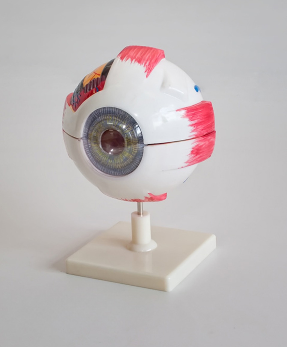 Model anatomiczny oka ludzkiego sześciokrotnie powiększony umieszczony na podstawie. Wyjmowane części modelu to: rogówka, tęczówka i soczewka, ciało szkliste.